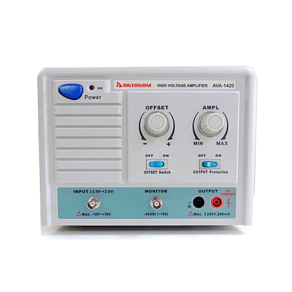 Амплитудные усилители АКТАКОМ AVA-1420 предназначены для усиления амплитуды сигналов в полупроводниковой и высоковольтной инженерии и в других областях. Приборы имеют коэффициент усиления по напряжению от 0 до 180 и снабжены несколькими ступенями защиты по выходу от перегрузки. Амплитуда выходного сигнала регулируется десятиоборотным резистором, что обеспечивает высокую точность управления. Кроме того, предусмотрена возможность установки смещения постоянной составляющей. Для контроля выходных характеристик предусмотрен выход «Monitor» с коэффициентом ослабления 100:1, предназначенный для подключения к осциллографу.