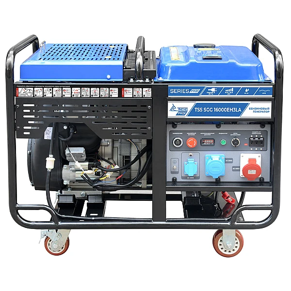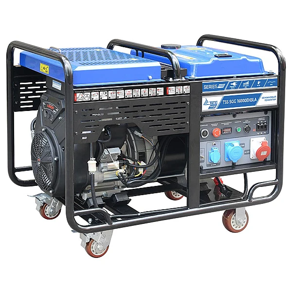 Бензиновый генератор TSS SGG 16000EH3LA - мобильная трехфазная электростанция высокой мощности с электростартером и поддержкой автозапуска. 15 кВт будет достаточно для организации полноценного питания жилого дома или рабочего объекта с сетью 380-400 В. Благодаря значительной энерговооруженности параллельно с этим можно подключить к установке и однофазные приборы, для которых предусмотрено сразу две розетки - стандартная формата “евро” и силовая. Однако, стоит помнить, что для таких потребителей будет доступно не более 5 кВт мощности, а нагрузку придется продумывать, чтобы избежать перекоса фаз.