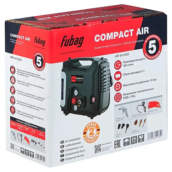 Купить Безмасляный компрессор FUBAG Compact Air + набор из 5 предметов в Кемерово легко — просто позвоните по телефону: 8-800-551-11-01