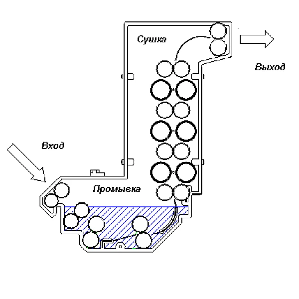 • Роликовая система, в которой ролики расположены в шахматном порядке. „Минимальный контакт“, обеспечивает безопасную, чистую обработку пленки.