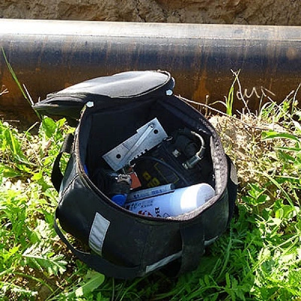 - сумка укомплектована выносной ручкой (петля на руку) и стальным тросом со съемными карабинами. Трос служит для переброса сумки лежневка-траншея или через трубу между двумя дефектоскопистами, подъема оборудования наверх при высотных работах.