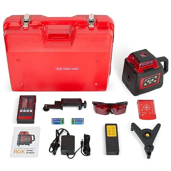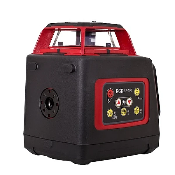Ротационный нивелир RGK SP-400 предназначен для работы с приёмником на расстоянии до 200 метров. Точность горизонтальной плоскости ±1 мм на 10 м, а вертикальной — ±1,5 мм на 10 м. Выравнивание выполняется с помощью сервоприводов в диапазоне ±5°. При выходе за пределы автовыравнивания лазер остановит вращение и отключится.