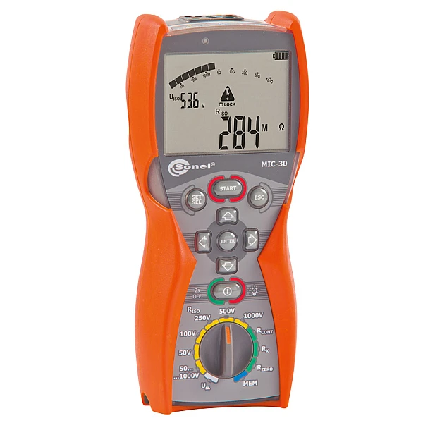 MIC-30 — цифровой мегаомметр, предназначенный для измерения сопротивления изоляции кабельных линий, проводов, обмоток трансформаторов, двигателей, других электро- и телекоммуникационных установок. Максимальное измерительное напряжение составляет 1000 В постоянного тока, а диапазон измеряемого сопротивления ограничен величиной в 100 ГОм. Установка трех интервалов времени позволяет автоматически рассчитывать коэффициенты абсорбции (увлажненности) и поляризации (старения). В процессе измерения сопротивления изоляции прибор отображает величину тока утечки, а также измеряет емкость кабеля.