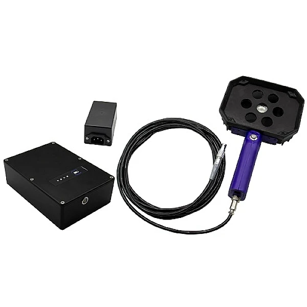 • Шесть высокомощных ультрафиолетовых светодиодов (UV-A LED) с длиной волны 365 нм позволяют осматривать большую поверхность с высокой интенсивностью освещения (5000 мкВт/кв.см на расстоянии 38мм в границах зоны диам.240мм).