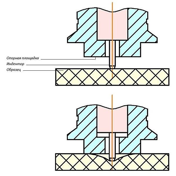 Принцип действия прибора основан на вдавливании индентора в исследуемый материал с определенной силой. Глубина вдавливания индентора пропорциональна твердости по Шору.