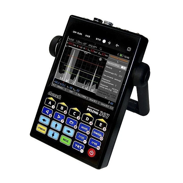 Дефектоскоп УД3-307ВД, известный также как «PELENG-307» («ПЕЛЕНГ-307») - прибор неразрушающего контроля, в основу функционирования которого положены технологии ультразвуковой и вихретоковой дефектоскопии. Семейство дефектоскопов «PELENG» («ПЕЛЕНГ»), в составе которого выпускается УД3-307ВД - это линейка ультразвуковых, вихретоковых и комбинированных дефектоскопов, которые за годы эксплуатации зарекомендовали себя как приборы, в полной мере отвечающие современным требованиям приборостроения и дефектоскопии. Помимо универсальности, дефектоскоп УД3-307ВД отличается компактностью и малым весом (не более 1,35 кг) и сохраняет работоспособность в широком диапазоне температур (-25°С ... +50°С). Удобство работы с прибором обеспечивает продуманный интерфейс: цифровая клавиатура, расположение функциональных кнопок непосредственно под экраном (одна кнопка - одна функция), возможность автоматического запоминания настроек и протоколов, защита результатов контроля и настроек от несанкционированного удаления.